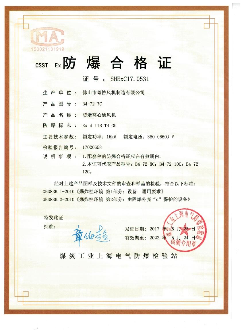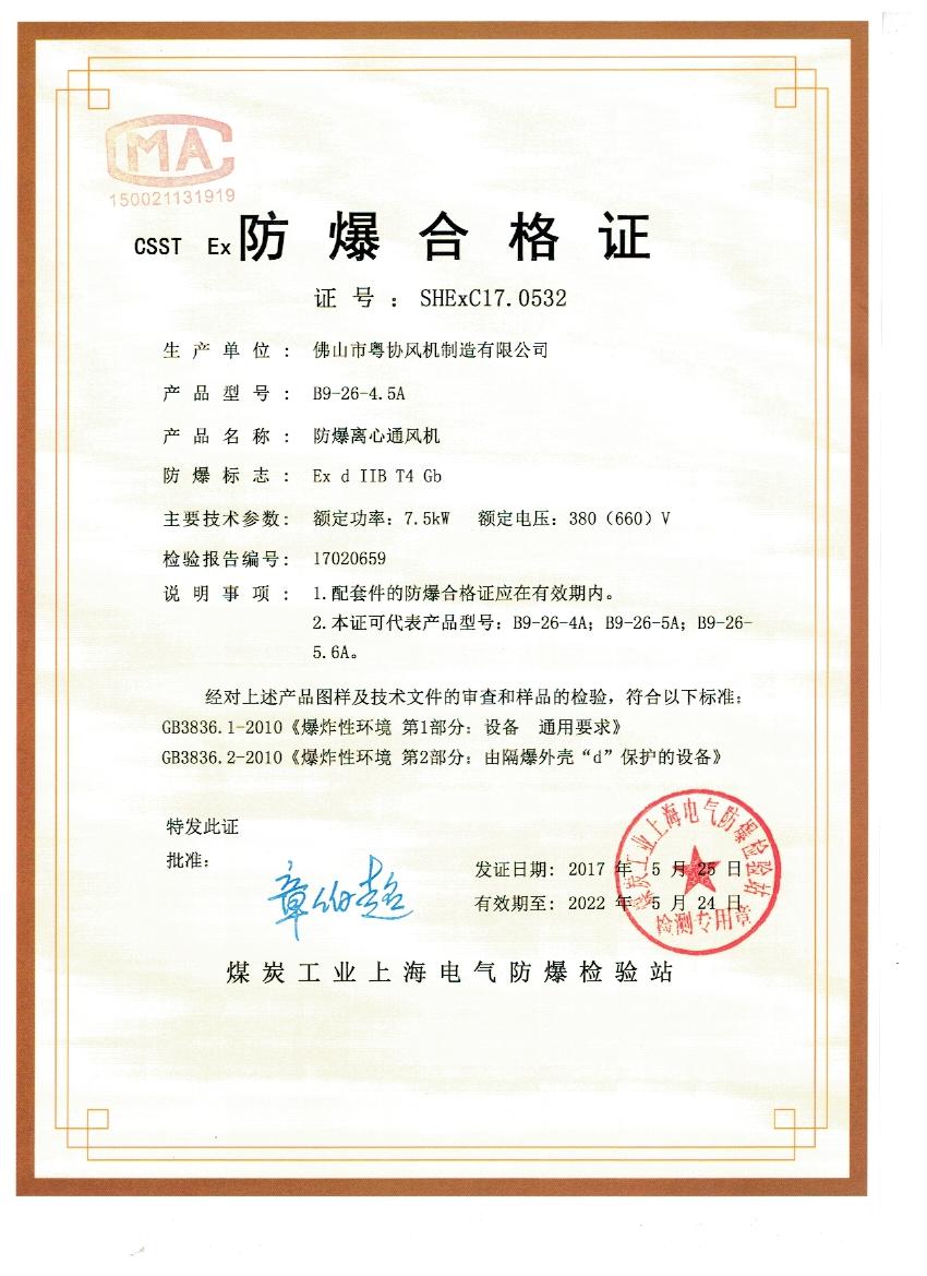 好消息!佛山粵協風機廠家生產的防爆離心通風機,高壓防爆離心通風機,獲得防爆證書。本證可代表產品型號:B4-72-8C、B4-72-10C、B4-72-12C。 B9-26-4A、B9-26-5A、B9-26-5.6A。表示粵協風機廠家的防爆離心通風機產品質量符合國家相關規定,穩定性、可靠性。
