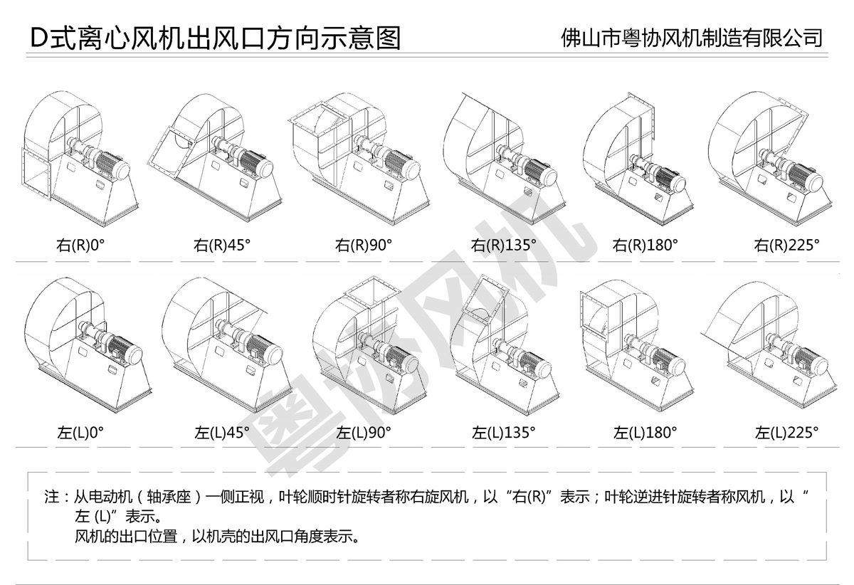 3、高壓離心通風機的出口位置以機殼的出口角度表示,“左”、“右”風機機殼制成0度、45度、90度、135度、180度、225度。